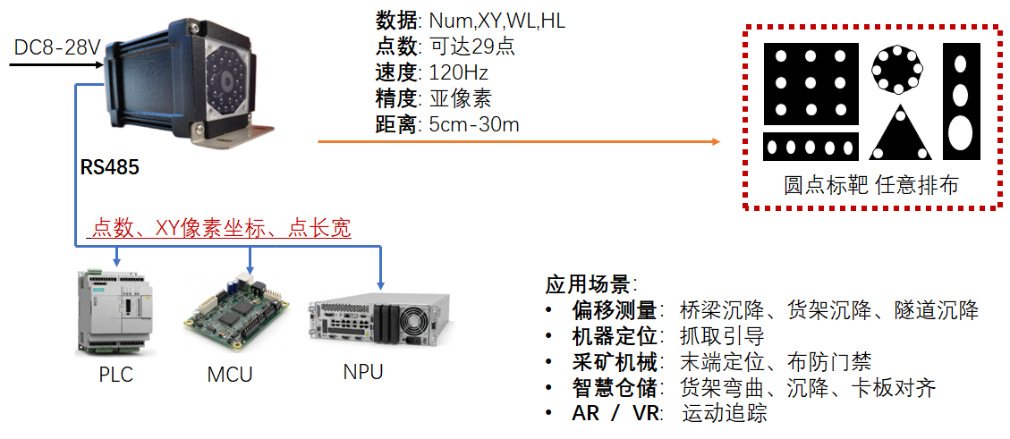 该相机不依赖于可见光,自主使用红外补光,通过同时定位多个特征点,增加定位的约束条件,减少误差,提高定位精度。适合于需要三维重建,姿态估计,结构化或者非结构化的场景,以及动态环境等使用。广泛适合于工业自动化,无人机导航,增强现实,自动驾驶,医疗影像等等行业。